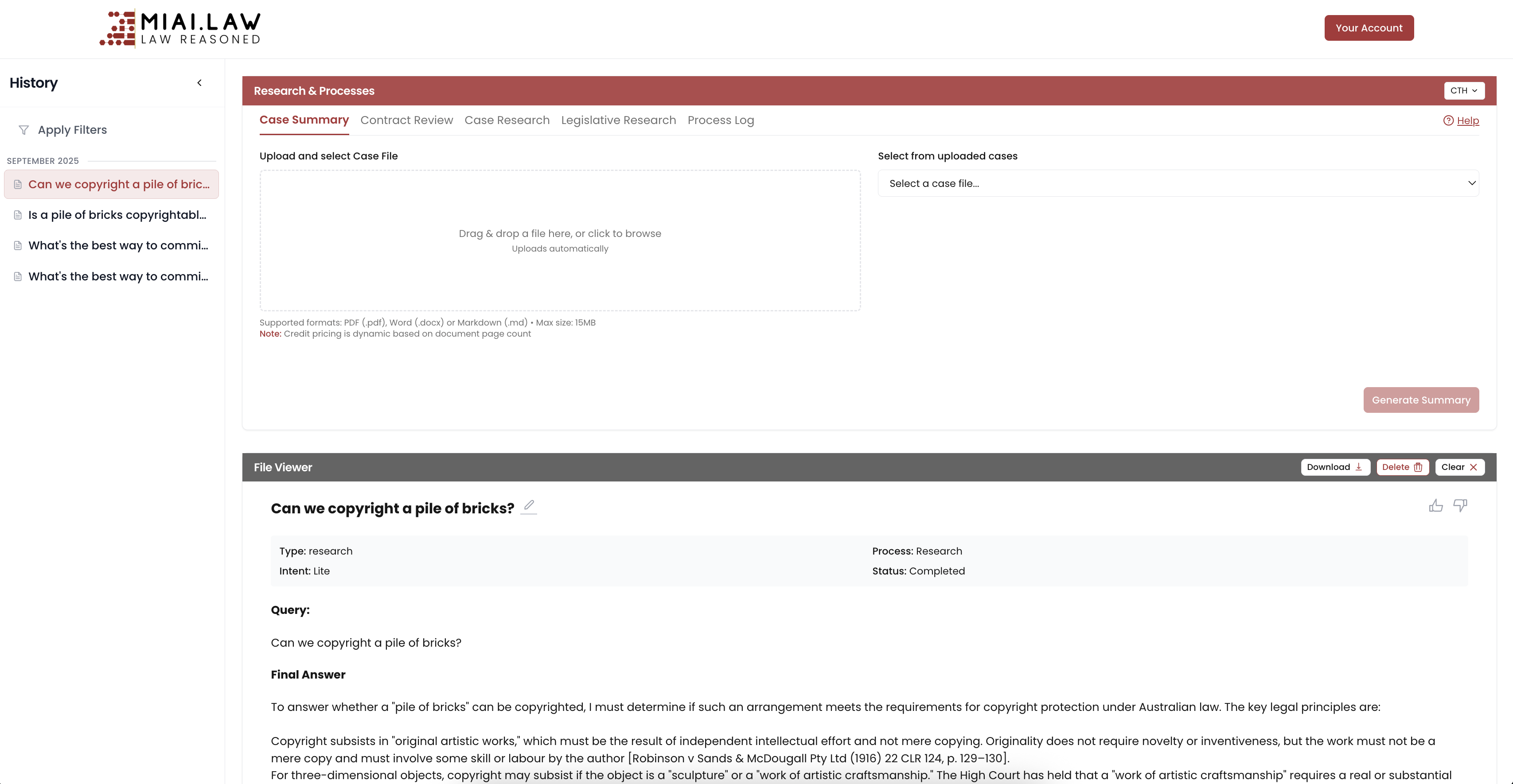 On the cover: Legal Research Assistant Platform This project was delivered for MiAI.law, an Australian legal technology firm, to build a modern AI-driven system for rapid, accurate legal research across case law and legislation. The platform supp...